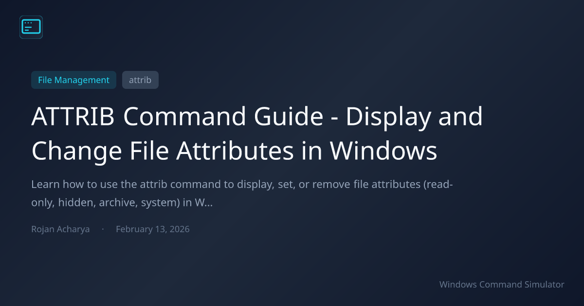 Learn how to use the attrib command to display, set, or remove file attributes (read-only, hidden, archive, system) in Windows Command Prompt. Includes syntax, examples, and best practices.