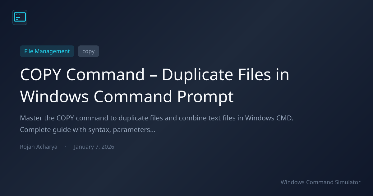 Master the COPY command to duplicate files and combine text files in Windows CMD. Complete guide with syntax, parameters, examples, and best practices.