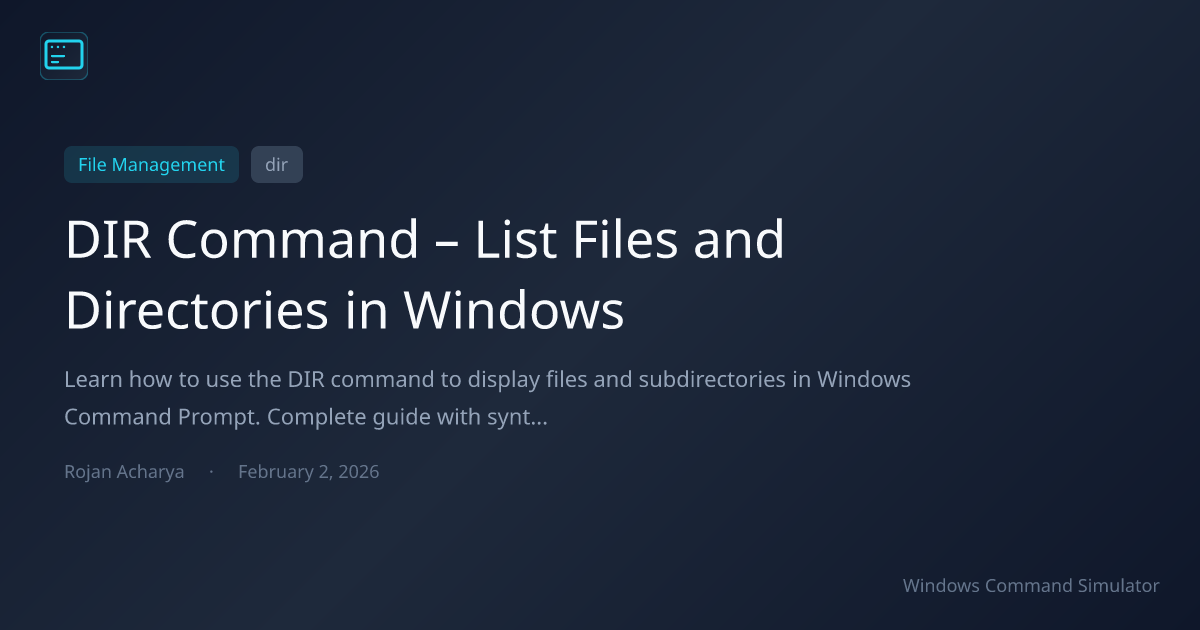 Learn how to use the DIR command to display files and subdirectories in Windows Command Prompt. Complete guide with syntax, parameters, examples, and best practices.