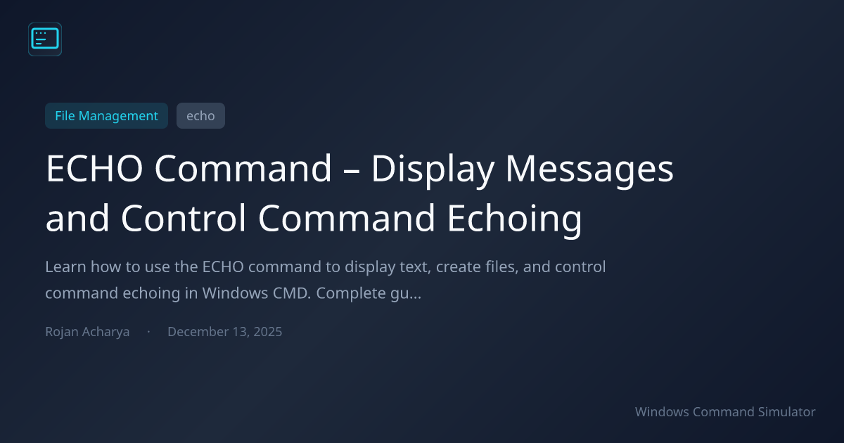 Learn how to use the ECHO command to display text, create files, and control command echoing in Windows CMD. Complete guide with syntax, examples, and tips.
