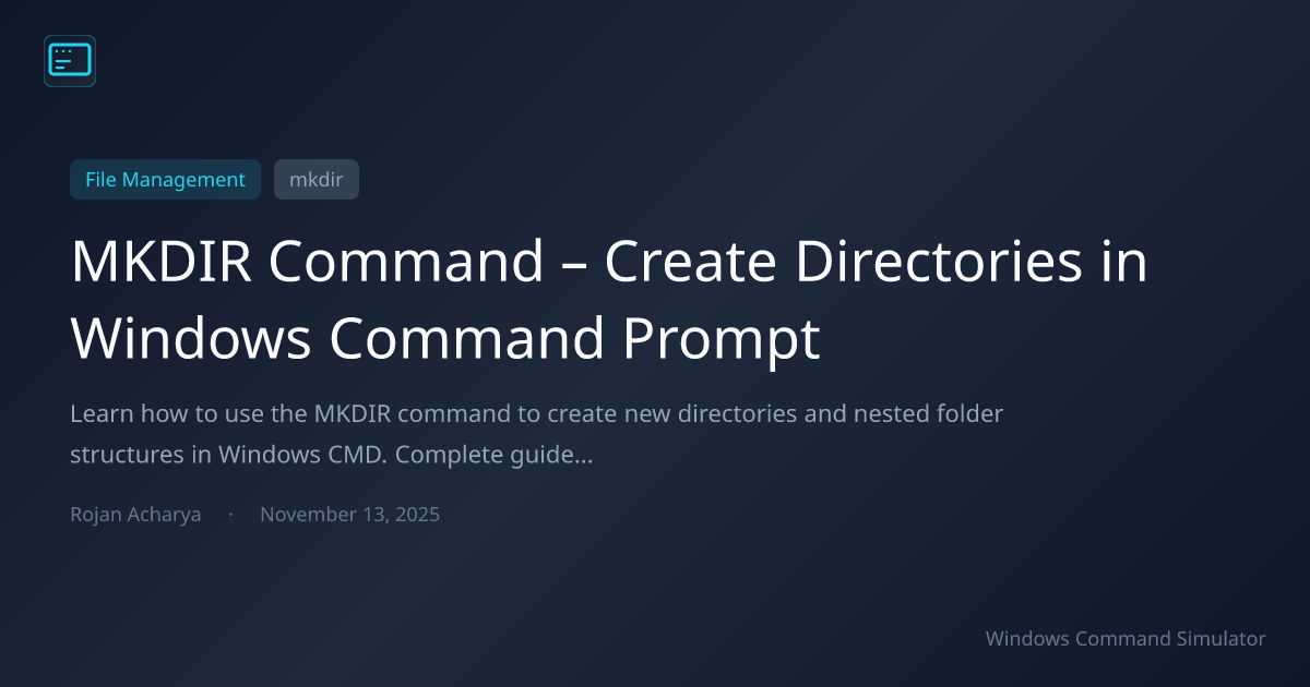 Learn how to use the MKDIR command to create new directories and nested folder structures in Windows CMD. Complete guide with syntax, examples, and best practices.