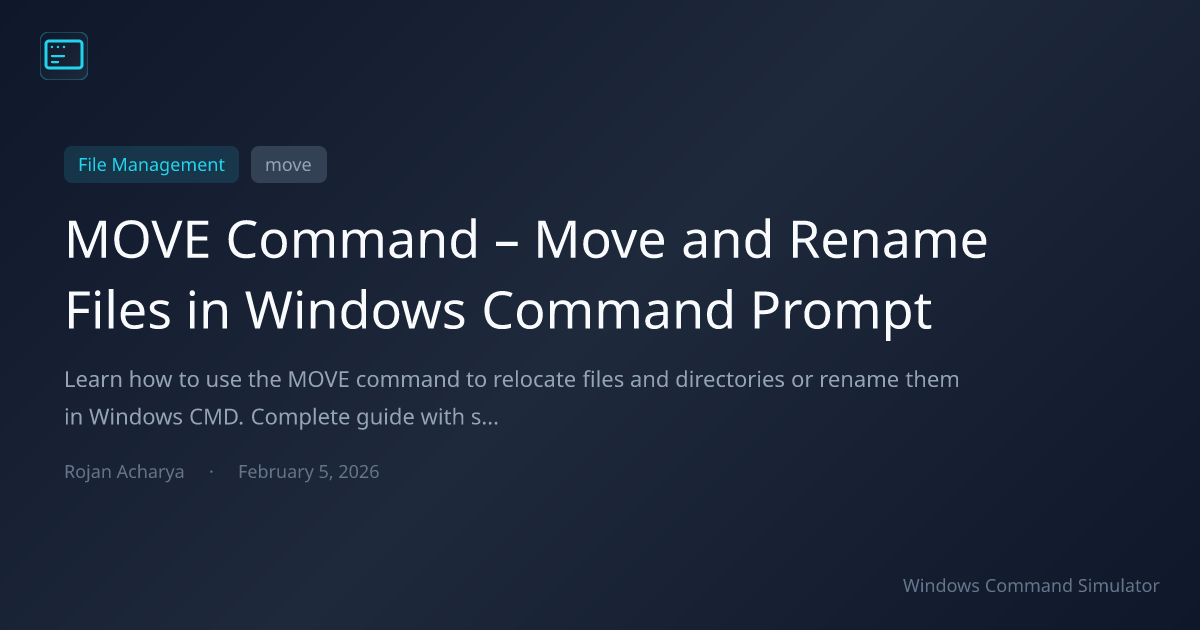 Learn how to use the MOVE command to relocate files and directories or rename them in Windows CMD. Complete guide with syntax, examples, and best practices.
