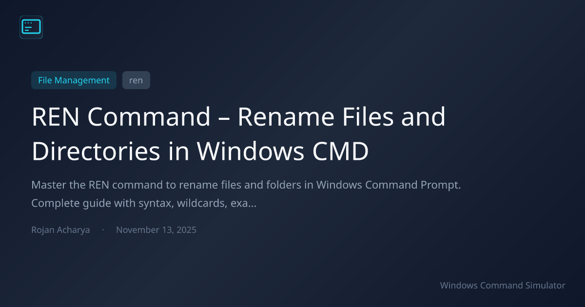 Master the REN command to rename files and folders in Windows Command Prompt. Complete guide with syntax, wildcards, examples, and best practices for renaming.