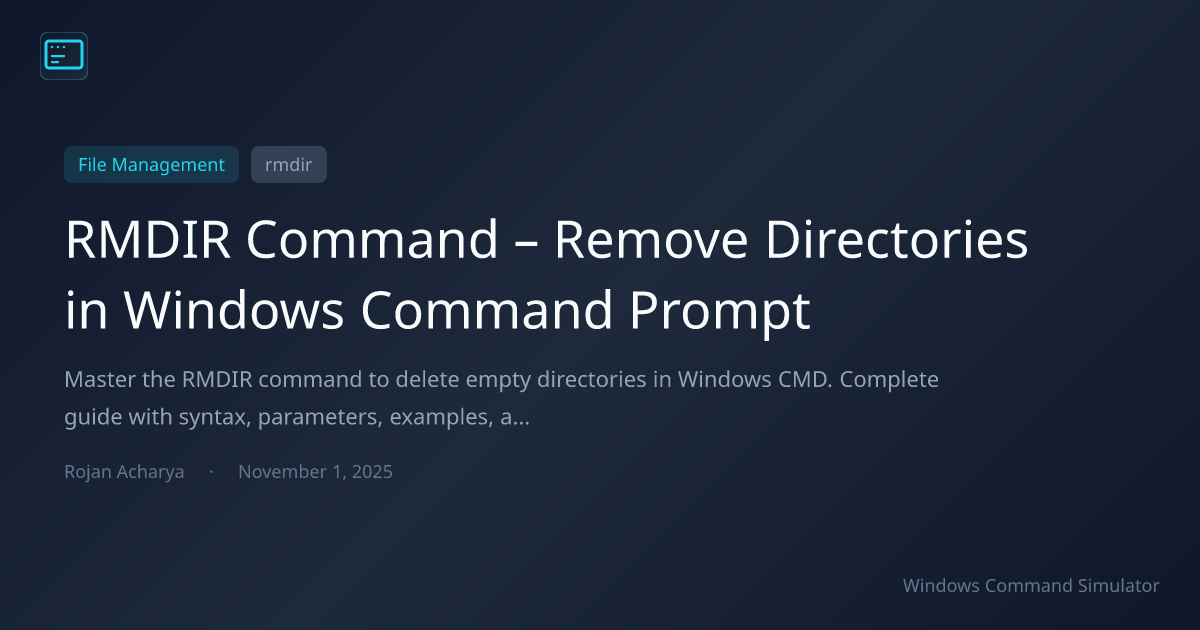 Master the RMDIR command to delete empty directories in Windows CMD. Complete guide with syntax, parameters, examples, and tips for removing folders safely.