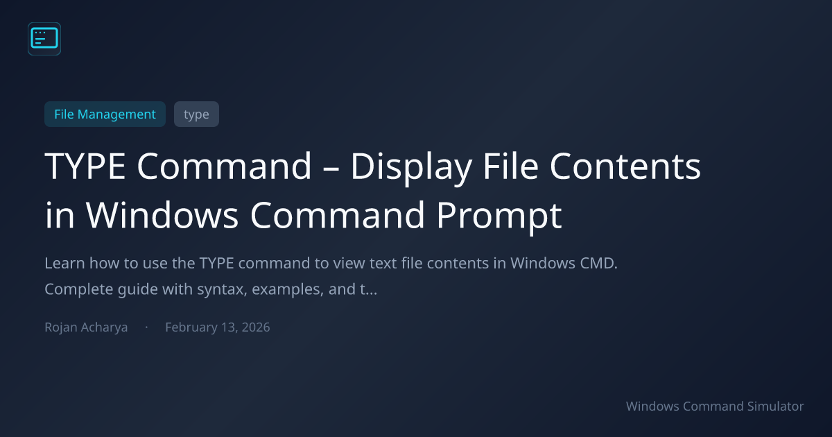 Learn how to use the TYPE command to view text file contents in Windows CMD. Complete guide with syntax, examples, and tips for displaying file content.