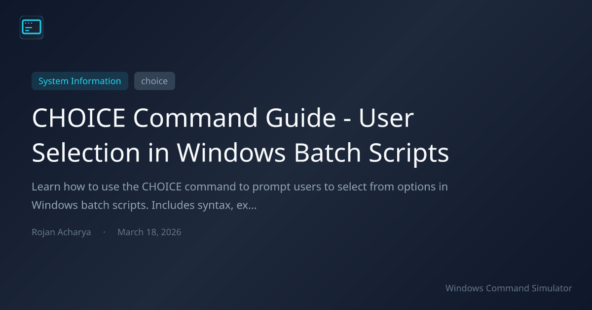 This comprehensive guide covers CHOICE syntax, all parameters, practical examples for common scenarios, ERRORLEVEL handling, troubleshooting tips, and frequently asked questions. By the end, you'll confidently add interactive prompts to your batch scripts.