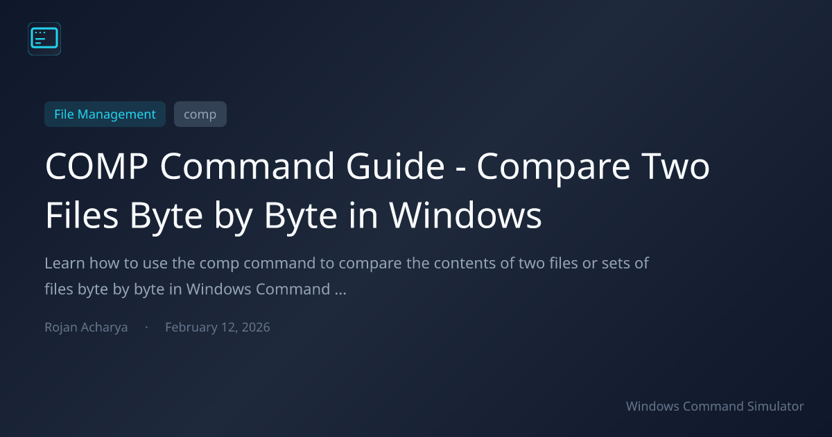 This comprehensive guide covers comp syntax, comparison options, practical examples for binary and text files, troubleshooting tips, comparison with fc command, related file utilities, and frequently asked questions. By the end, you'll confidently use comp for file integrity verification, quality assurance, and data validation tasks from the command line.