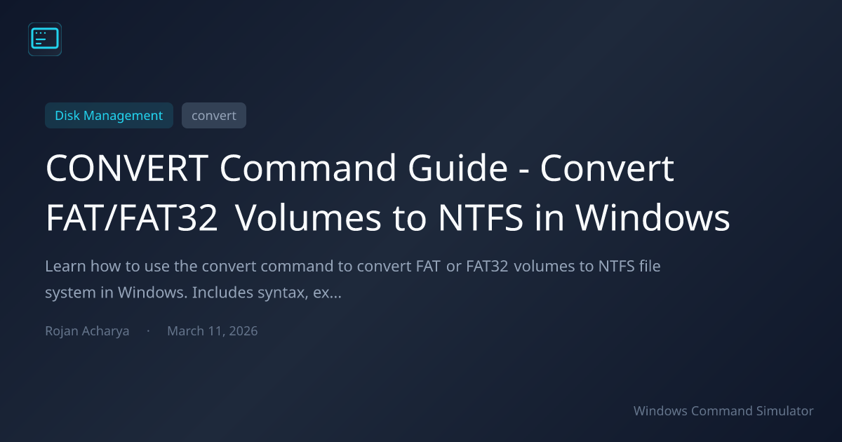 Learn how to use the convert command to convert FAT or FAT32 volumes to NTFS file system in Windows. Includes syntax, examples, prerequisites, and conversion best practices.