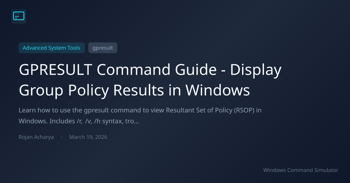 Practice the gpresult command safely in our Windows Command Simulator. Explore gpupdate for refreshing policy, the Commands Reference for all Windows CMD utilities, and net view for network resource discovery.