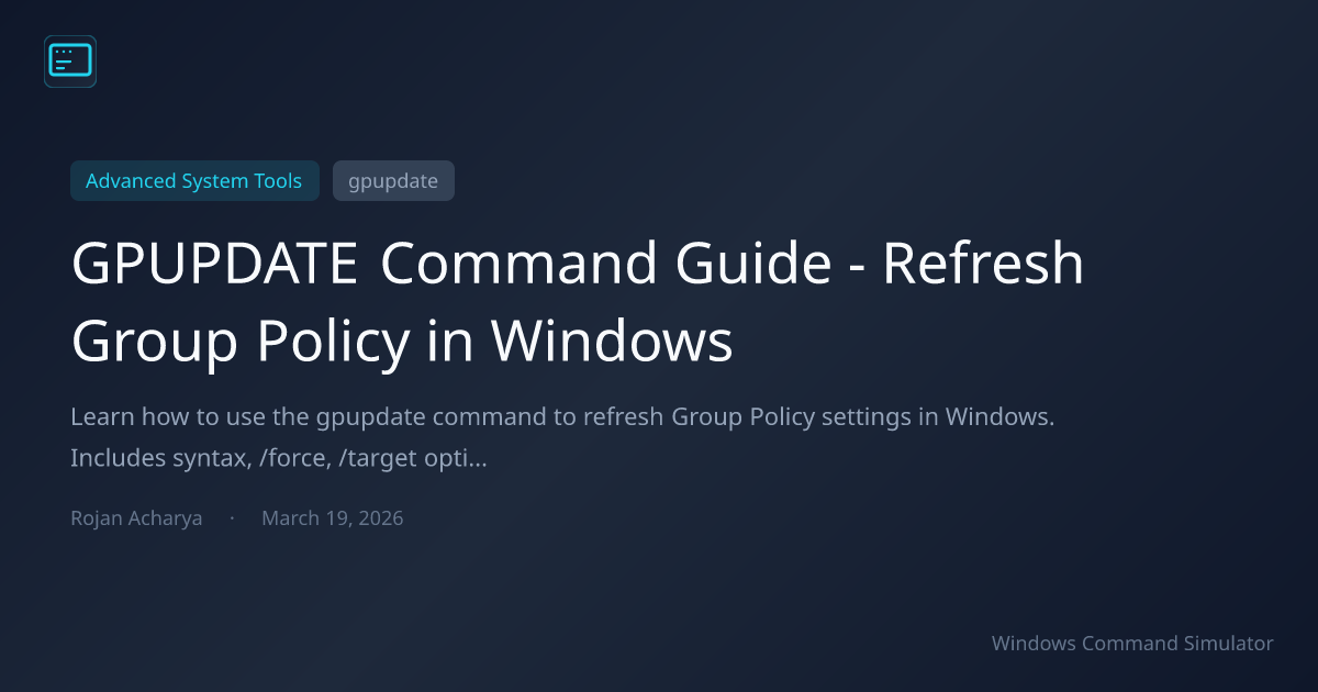 Practice the gpupdate command safely in our Windows Command Simulator. Explore gpresult for verifying policy application, the Commands Reference for all Windows CMD utilities, and net share for network resource management.
