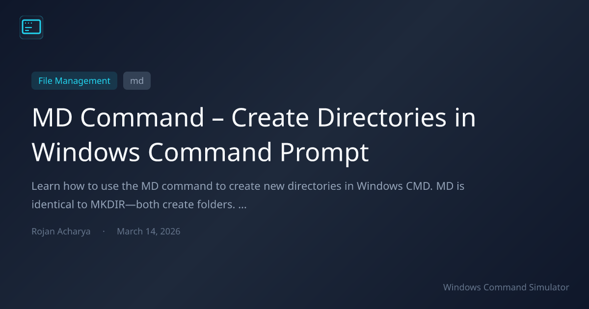Learn how to use the MD command to create new directories in Windows CMD. MD is identical to MKDIR—both create folders. Complete guide with syntax, examples, and best practices.