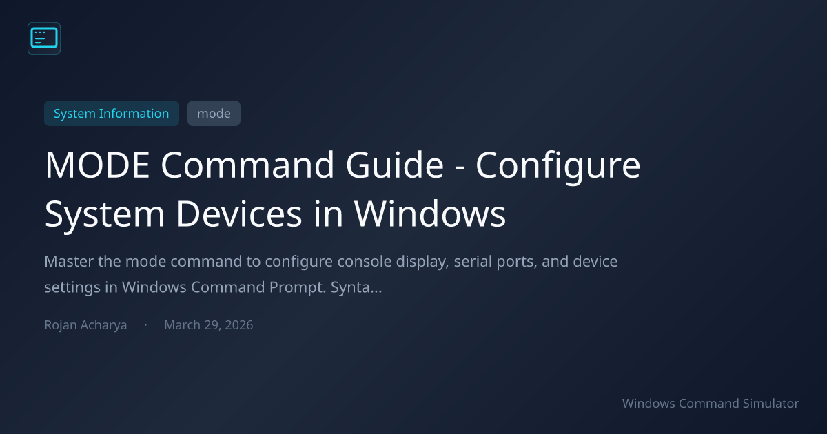 Master the mode command to configure console display, serial ports, and device settings in Windows Command Prompt. Syntax, examples, and troubleshooting tips.