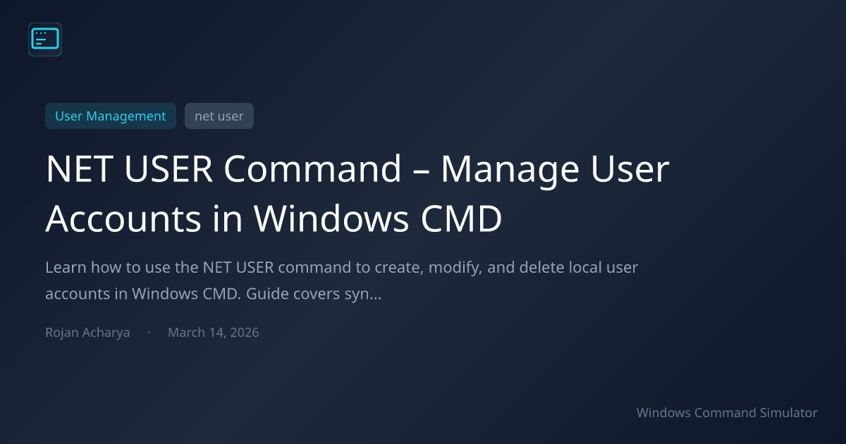 Learn how to use the NET USER command to create, modify, and delete local user accounts in Windows CMD. Guide covers syntax, /add, /delete, password options, and user management best practices.