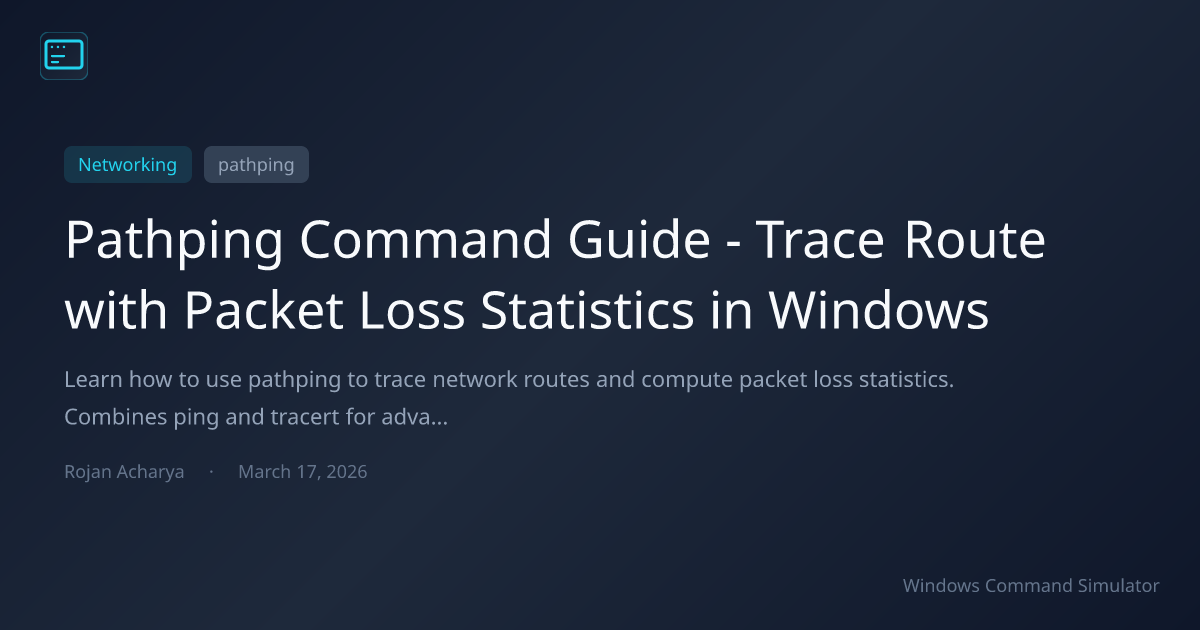 Practice pathping in our interactive Windows Command Simulator to trace routes and view statistics safely. Explore our Commands Reference for tracert, ping, and other network tools. For related guides, see tracert, ping, and ipconfig.