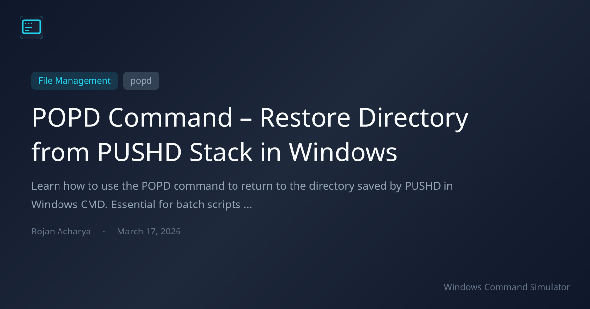 Learn how to use the POPD command to return to the directory saved by PUSHD in Windows CMD. Essential for batch scripts and navigation workflows.