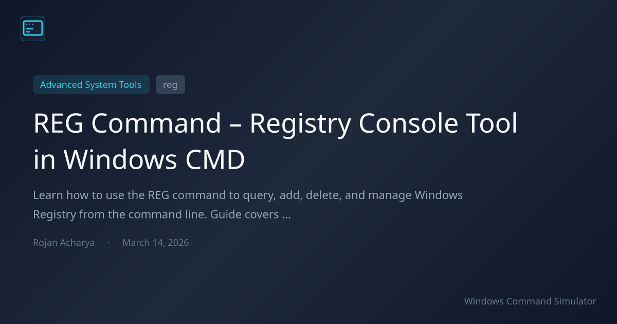 Learn how to use the REG command to query, add, delete, and manage Windows Registry from the command line. Guide covers REG QUERY, REG ADD, REG DELETE, syntax, and examples.