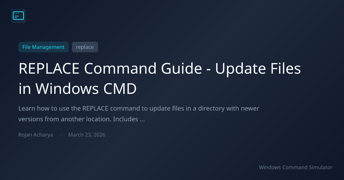 This comprehensive guide covers replace syntax, all parameters including /A, /R, /S, and /U, practical examples for deployment and sync scenarios, troubleshooting tips, related commands, and frequently asked questions. By the end, you'll confidently use replace for file update operations from the command line.