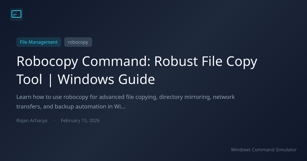 The robocopy command (Robust File Copy) is a Windows Command Prompt utility designed for reliable file and directory copying with advanced features including resumable transfers, retry logic, mirroring, filtering, and logging. Use robocopy for network file transfers that survive interruptions, automated backup solutions, directory synchronization, and enterprise file migrations that require verification and detailed logging.