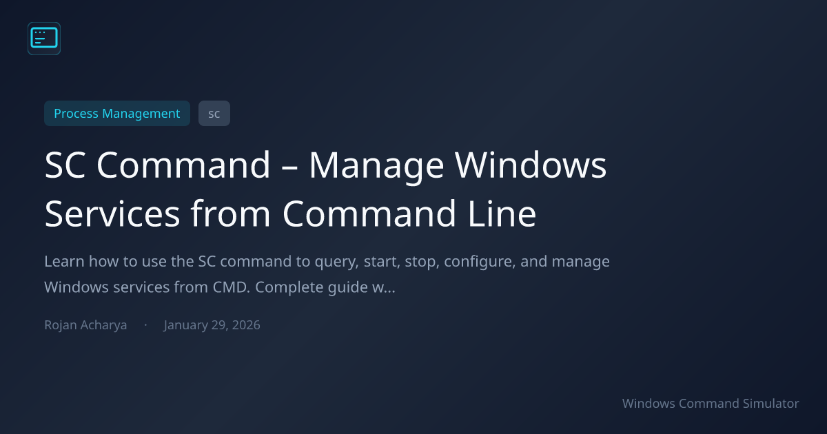 Learn how to use the SC command to query, start, stop, configure, and manage Windows services from CMD. Complete guide with syntax, examples, and troubleshooting tips.