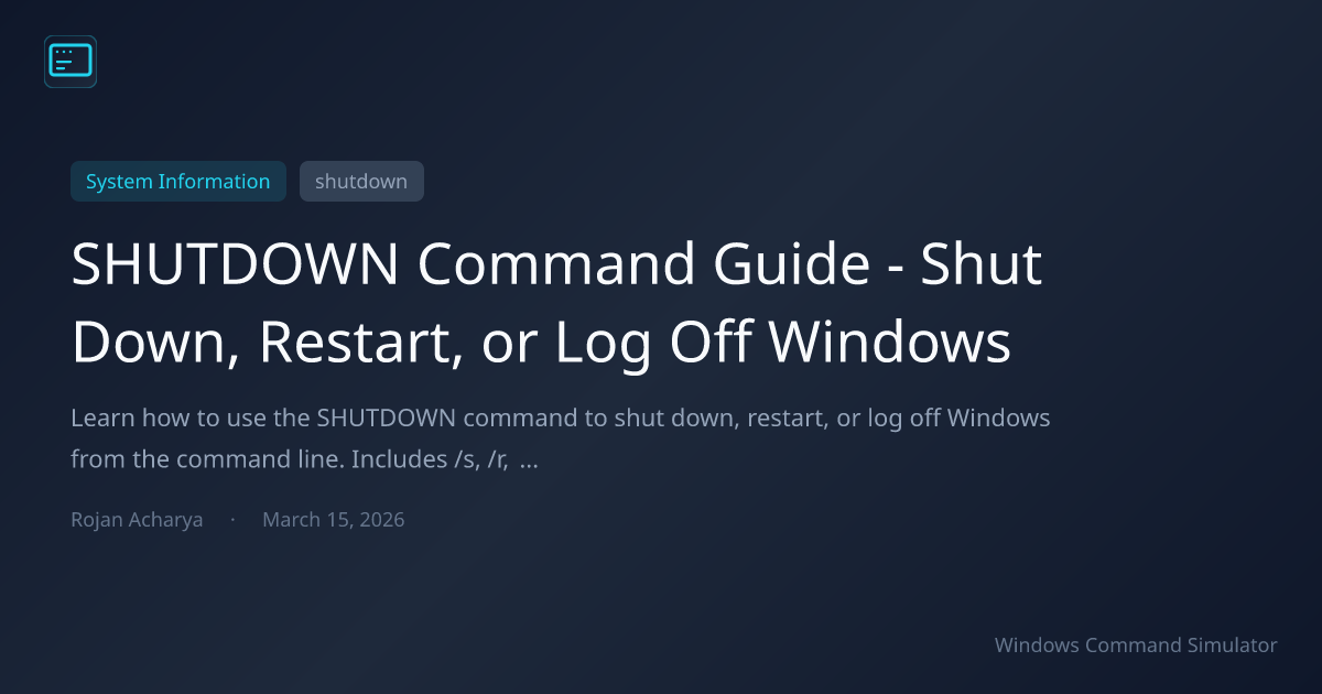 Learn how to use the SHUTDOWN command to shut down, restart, or log off Windows from the command line. Includes /s, /r, /l, /t, /a options, remote shutdown, and scripting examples.
