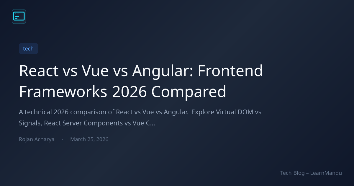 A technical 2026 comparison of React vs Vue vs Angular. Explore Virtual DOM vs Signals, React Server Components vs Vue Composition API vs Angular standalone components. Which frontend framework is best?