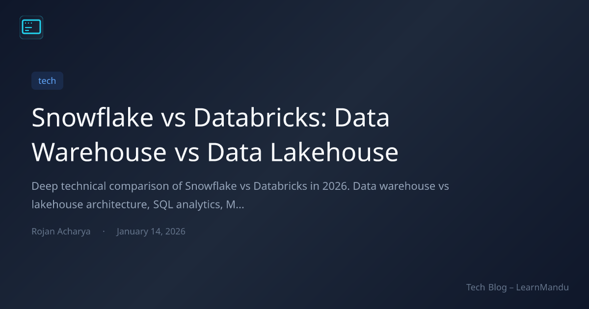 Deep technical comparison of Snowflake vs Databricks in 2026. Data warehouse vs lakehouse architecture, SQL analytics, ML pipelines, pricing, and enterprise use cases.