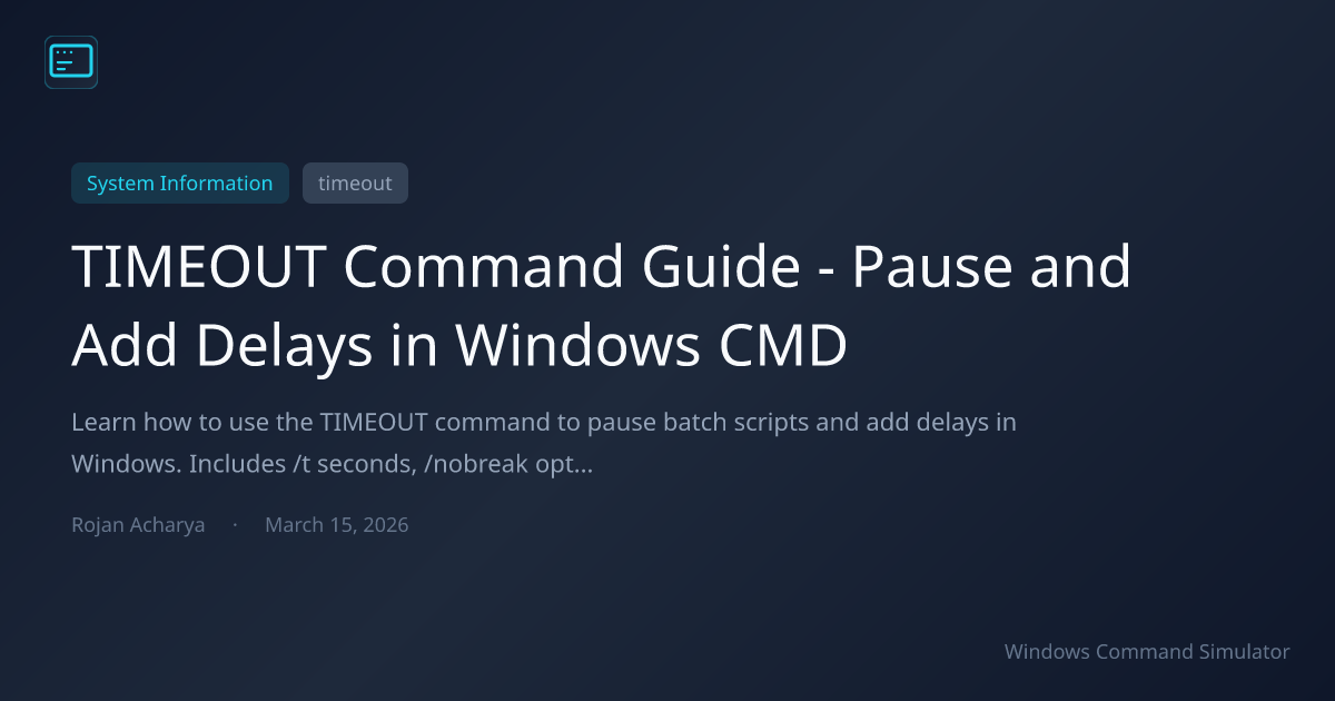The TIMEOUT command provides native, portable delays for Windows batch scripts. Use /t for duration and /nobreak when key skip must be disabled. Essential for deployment scripts, user prompts, and automation. Practice in the simulator or browse the commands reference for more Windows command guides.