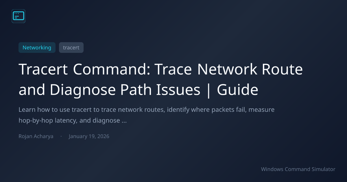 Explore our complete Windows Commands reference for detailed syntax and options for tracert and 200+ other commands. For related network diagnostics topics, check out our guides on ping, ipconfig, netstat, and nslookup.