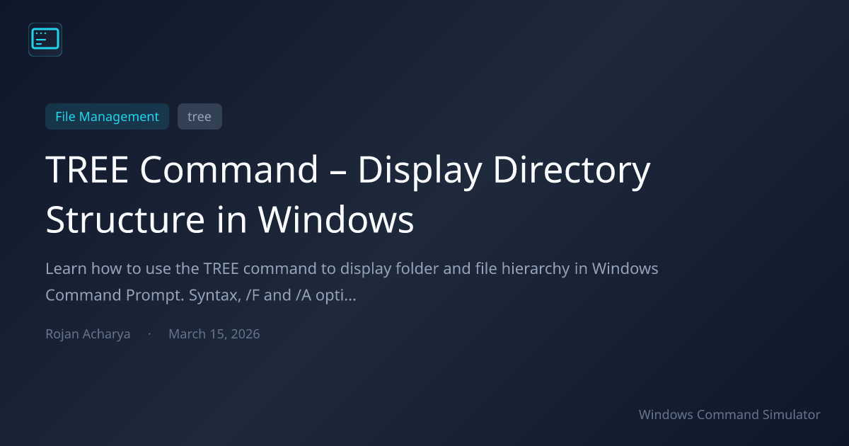 Learn how to use the TREE command to display folder and file hierarchy in Windows Command Prompt. Syntax, /F and /A options, examples, and when to use TREE vs DIR.