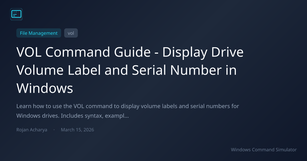 The VOL command provides instant access to volume labels and serial numbers for any Windows drive. Use it for drive identification, script validation, and troubleshooting. Combine with the label command for complete volume metadata management. Practice in the simulator or browse the commands reference for more Windows command guides.